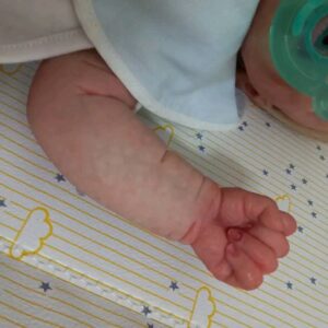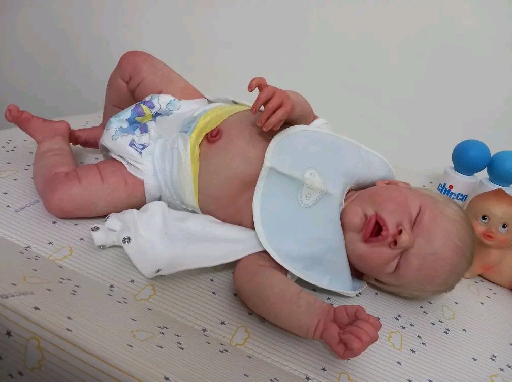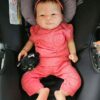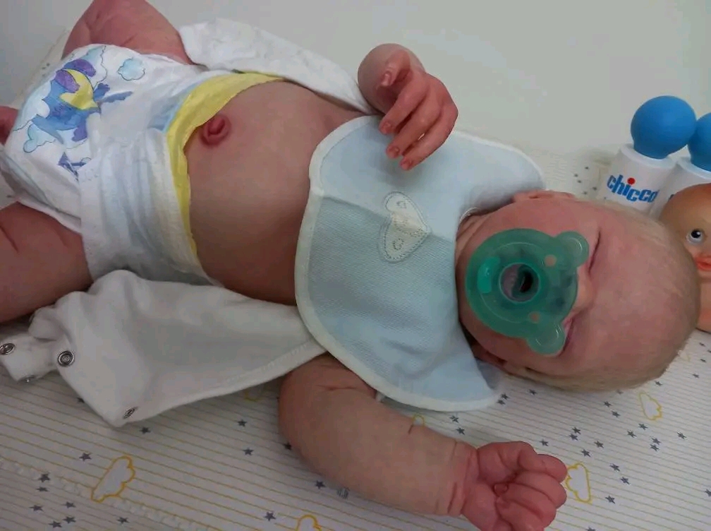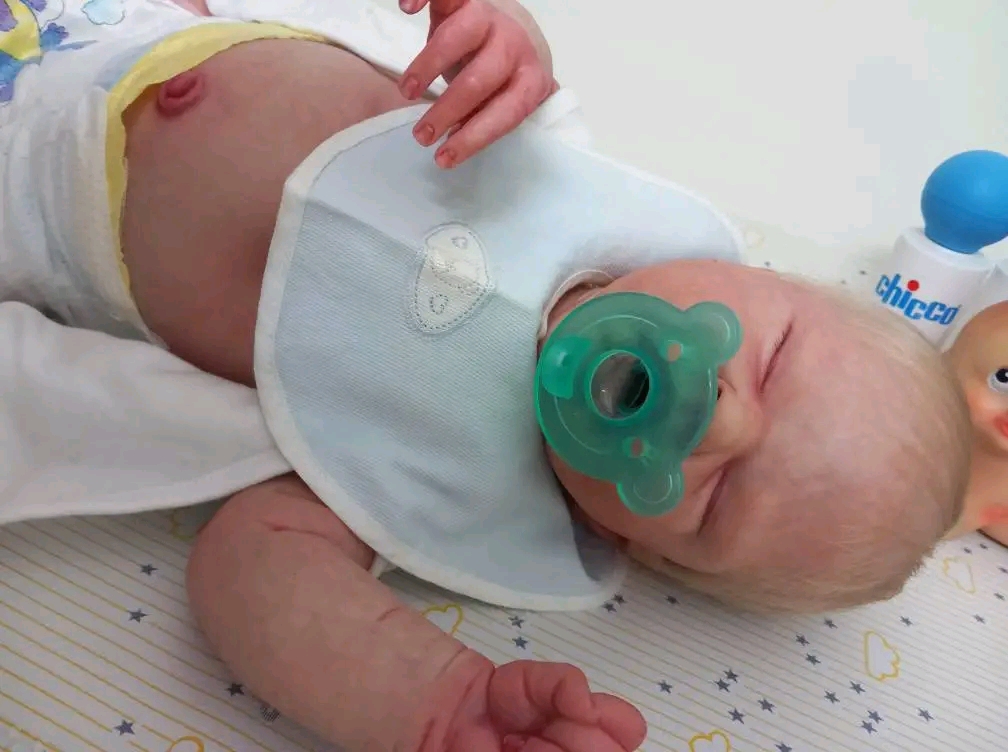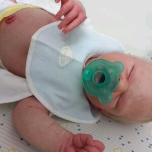 TWO Vintage glass baby bottles that are permanently filled with fake milk and no hole nipples. An 8 oz with a yellow rim and a 4 oz with a pink rim.
